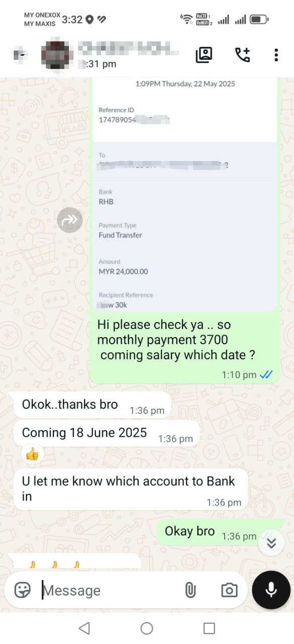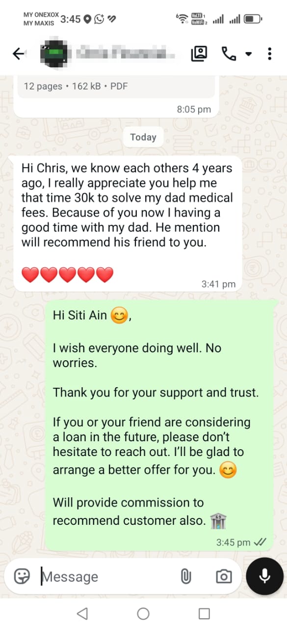Annual interest rate is between 12% to 18%*. Loan term is between 90 days to 24 months. For example, a loan of RM1,000 for a term of 1 year with a monthly interest rate of 1.5%, will incur a total repayment value of RM1,180. No associated fees.